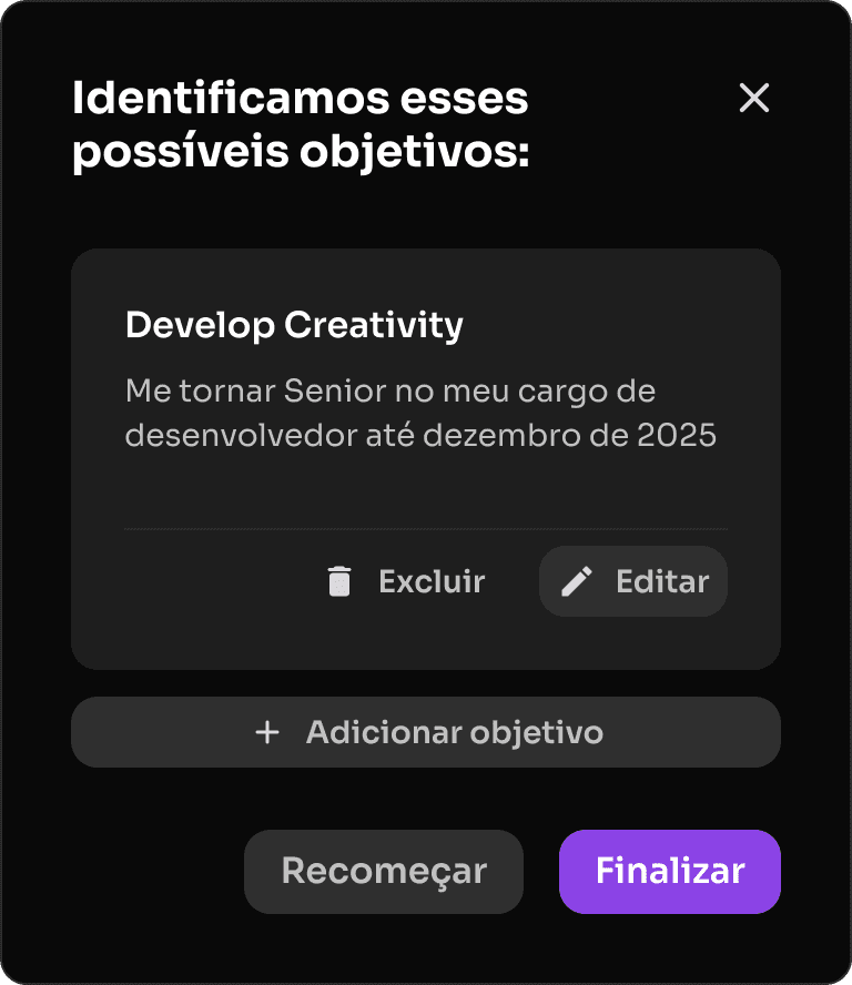 Ninguém perdido. Integramos dinâmicas de Goal Setting com IA conversacional que ajudam as pessoas a refletir sobre seus objetivos e aspirações.